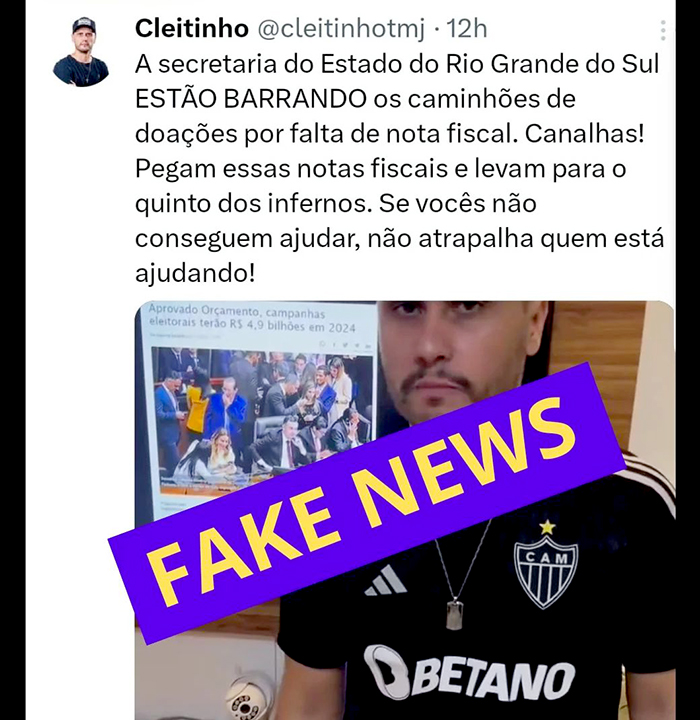 Carlos Teixeira, auditor fiscal do estado, foi às redes sociais rebater a mentira. “Nenhuma carga com doações está sendo barrada nos postos fiscais. A orientação da Receita Estadual é colaborar na assistência e reconstrução do Estado do RS. Pessoas que espalham fake news como esta prestam um desserviço ao país”.