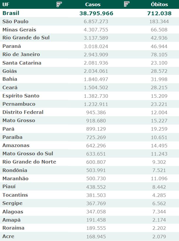 As secretarias estaduais de Saúde contabilizaram, desde o início da pandemia, em todo o país 38.795.966 diagnósticos positivos e 712.038 mortes em decorrência da Covid-19.