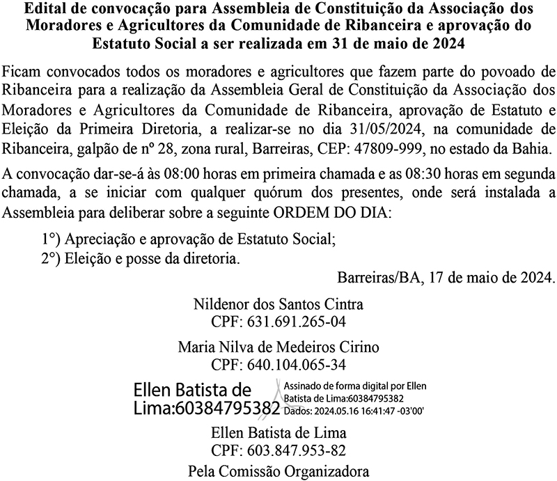 EDITAL DE CONVOCAÇÃO PARA ASSEMBLEIA DE CONSTITUIÇÃO DA ASSOCIAÇÃO DOS MORADORES E AGRICULTORES DA COMUNIDADE DE RIBANCEIRA E APROVAÇÃO DO ESTATUTO SOCIAL A SER REALIZADA EM 31 DE MAIO DE 2024