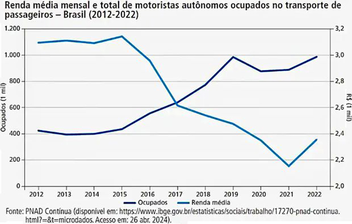 Nos períodos indicados, houve aumento do número de trabalhadores disponíveis. Entre 2012 e 2015, a oferta de mão de obra de motoristas autônomos no setor de transporte de passageiros era de cerca de 400 mil trabalhadores. Em 2022, o total de ocupados se aproximava de 1 milhão. Já o número de entregadores inscritos nas plataformas saltou de 56 mil para 366 mil entre 2015 e 2021.
