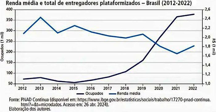 Os dados citados foram apurados no estudo Plataformização e precarização do trabalho de motoristas e entregadores no Brasil, do Instituto de Pesquisa Econômica Aplicada (Ipea), a partir de dados do Instituto Brasileiro de Geografia e Estatística (IBGE) - Pesquisa Nacional por Amostra Domicílios Contínua (Pnad). Tanto para motoristas quanto para entregadores, a média dos rendimentos dos trabalhadores inscritos nas plataformas era inicialmente superior à média dos ocupados em atividades semelhantes.