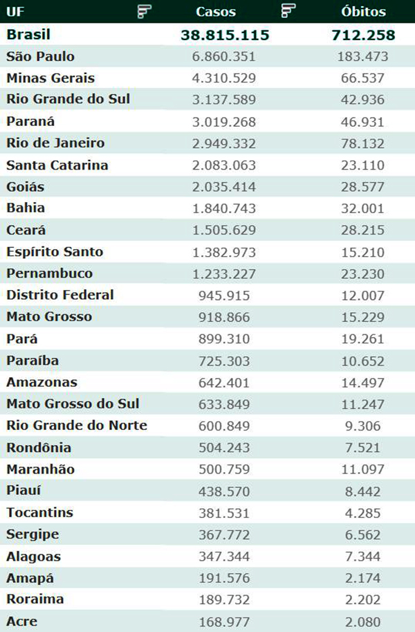 As secretarias estaduais de Saúde contabilizaram, desde o início da pandemia, em todo o país 38.815.115 diagnósticos positivos e 712.258 mortes em decorrência da Covid-19.