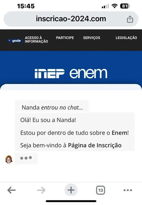 “Eu olhei e estava direitinho o design, o layout. A página era igual, estava escrito ‘Inscrição Enem 2024’, tinha o robozinho (chat de inteligência artificial) que ensina o passo a passo”, lembra Mônica, destacando as semelhanças.