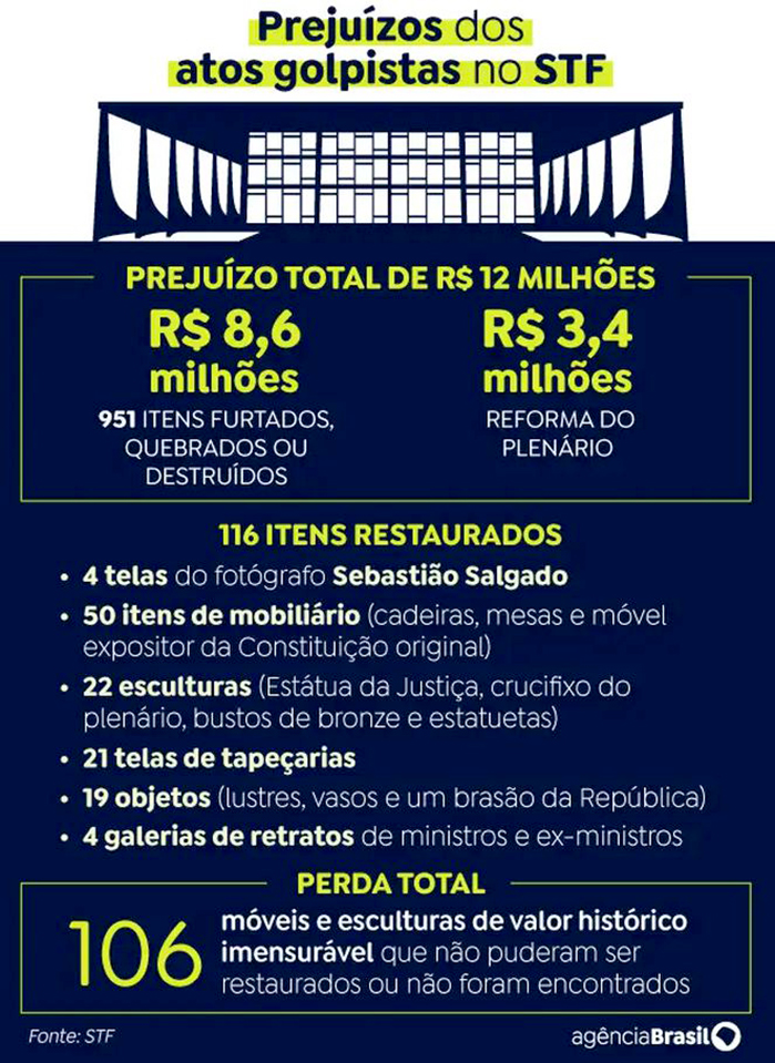 Prejuízos dos atos golpistas no STF. Foto: Arte/EBC - Arte/EBC