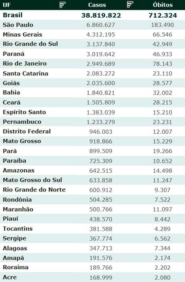 As secretarias estaduais de Saúde contabilizaram, desde o início da pandemia, em todo o país 38.819.822 diagnósticos positivos e 712.324 mortes em decorrência da Covid-19.