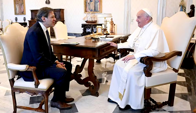 Em troca, o ministro recebeu a Medalha Pontifícia, concedida a quem participa de audiências com o papa. Ocorrido no Palácio Papal, no Vaticano, o encontro foi o último compromisso da viagem do ministro da Fazenda à Itália. Neste momento, Haddad retorna ao Brasil.