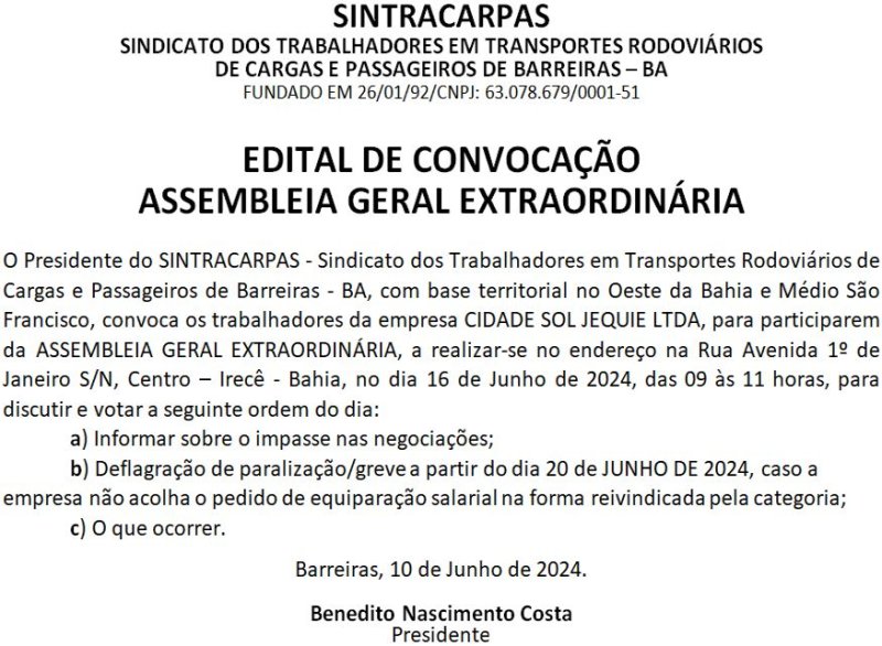 SINTRACARPAS - EDITAL DE CONVOCAÇÃO - ASSEMBLEIA GERAL EXTRAORDINÁRIA