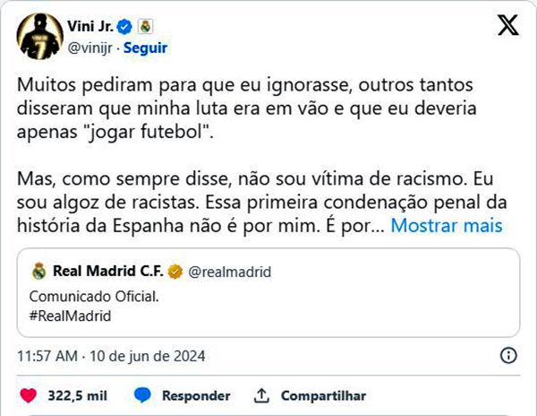 “Muitos pediram para que eu ignorasse, outros tantos disseram que minha luta era em vão e que eu deveria apenas ‘jogar futebol’. Mas, como sempre disse, não sou vítima de racismo. Eu sou algoz de racistas. Essa primeira condenação penal da história da Espanha não é por mim. É por todos os pretos. Que os outros racistas tenham medo, vergonha e se escondam nas sombras. Caso contrário, estarei aqui para cobrar. Obrigado a La Liga e ao Real Madrid por ajudarem nessa condenação histórica. Vem mais por aí”, publicou o jogador do Real Madrid (Espanha) e da seleção brasileira em seu perfil em uma rede social.