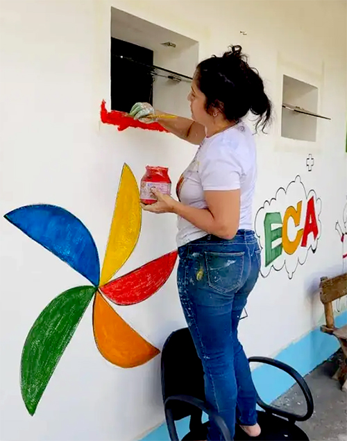 O contorno com a família em mãos dadas, o balão colorido com as crianças, e o cata-vento. Nas paredes e muros na região administrativa do Cruzeiro (DF), a conselheira tutelar Viviane Dourado, de 49 anos, resolveu traduzir ideais com tintas e pincel. Ela, que é designer e educadora social, entende que a arte pode ser estratégia para aproximação com famílias para combater a violência contra a infância.