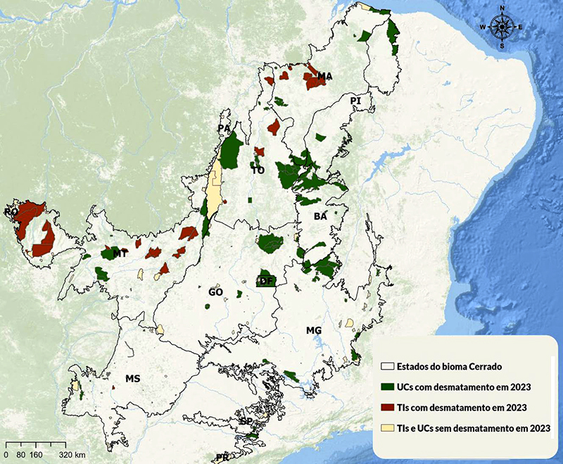 A área desmatada em terras indígenas do Cerrado chegou a mais de 7 mil hectares, um aumento de 188% em 2023, enquanto, no geral, as terras indígenas do país reduziram 27% da área desmatada. Porquinhos dos Canela-Apãnjekra, lar dos indígenas Canela Apanyekrá, foi o território indígena com a maior área desmatada de todo o país em 2023, perdendo mais de 2 mil hectares. O número representa um aumento de 608% na sua área desmatada, em relação ao ano anterior. Delimitada em 2019, o território está localizado na porção sul do Maranhão, estado mais desmatado do Brasil em 2023 e palco do crescimento das áreas de agropecuária.