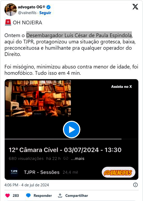O desembargador Luís César de Paula Espíndola, condenado pelo Superior Tribunal de Justiça (STJ), em 2023, por violência doméstica, disse, durante uma audiência na última quarta-feira (3), que “as mulheres estão loucas atrás de homens”. As informações foram divulgadas pelo jornalista Guilherme Amado, em sua coluna no Metrópoles.