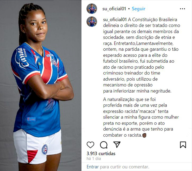 “O Esporte Clube Bahia SAF manifesta toda solidariedade a Suelen ao tempo em que cobra resposta à altura da gravidade do assunto, reiterando compromisso na luta contra qualquer tipo de discriminação”, garantiu a agremiação.