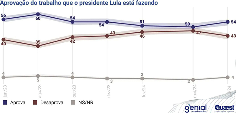 Pesquisa Genial/Quaest divulgada quarta-feira (10) indica que a aprovação do governo Lula cresceu para 54%, enquanto desaprovação passou para 43%. Este é o melhor resultado de aprovação do governo em 2024.