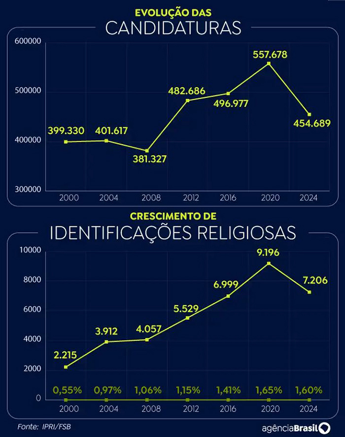 Em 2000, o número de candidaturas com identidade religiosa foi de 2.215, em termos absolutos. Já em 2024, chegou a 7.206 (+225%). Nesse mesmo intervalo de 24 anos, o número total de candidaturas subiu 14%, passando de 399.330, em 2000, para 454.689 nas eleições municipais deste ano. Em 2000, o número de candidaturas com identidade religiosa representava 0,55% do total, enquanto nas eleições deste ano elas representam 1,6% do número total de candidatos inscritos.