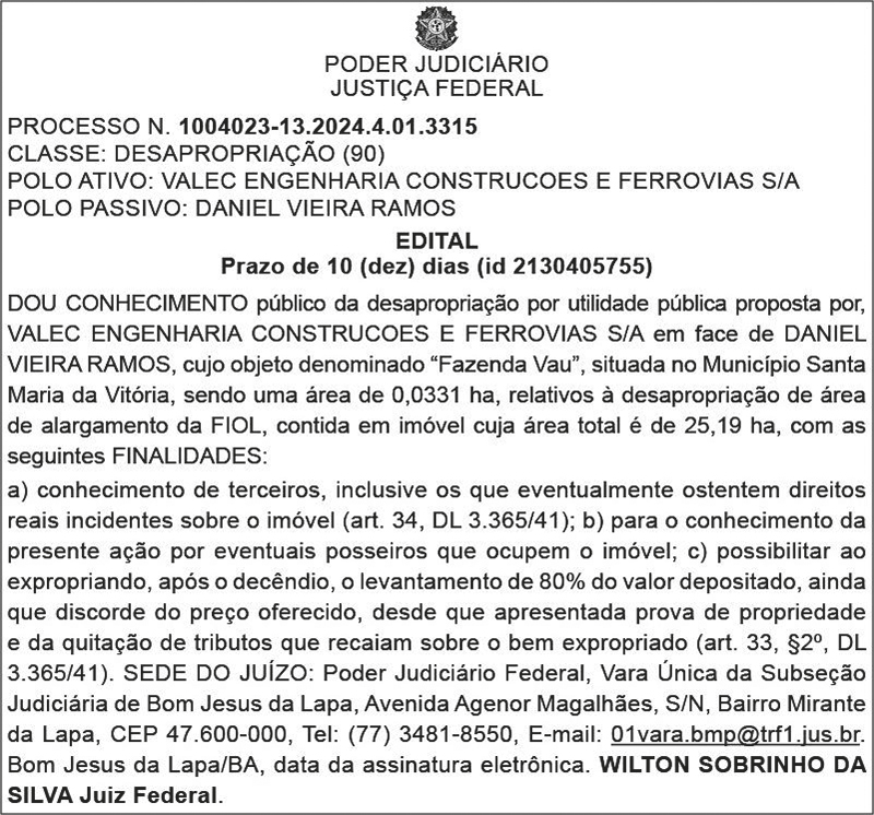 PODER JUDICIÁRIO/JUSTIÇA FEDERAL - EDITAL DE DESAPROPRIAÇÃO - POLO PASSIVO: DANIEL VIEIRA RAMOS - FAZENDA VAU NO MUNICÍPIO DE SANTA MARIA DA VITÓRIA - BAHIA