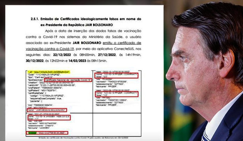 O tenente-coronel Mauro Cid, ajudante de ordens do ex-presidente Jair Bolsonaro, afirmou, em delação premiada, que recebeu ordens do então presidente para inserir dados falsos de vacinação contra a covid-19. O objetivo era conseguir certificados de vacinação fraudulentos em nome de Bolsonaro e de sua filha, uma vez que o ex-presidente não se imunizou contra a doença.