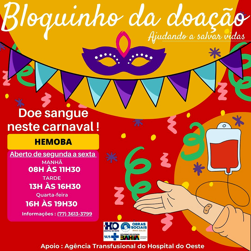 O Hospital do Oeste (HO), unidade vinculada ao governo estadual e administrada pelas Obras Sociais Irmã Dulce (OSID) no município de Barreiras, por meio da Agência Transfusional, está em campanha para estimular as doações de sangue neste período que precede o Carnaval. Com estoques de sangue em níveis críticos, o complexo hospitalar, em parceria com a Fundação de Hematologia e Hemoterapia do Estado da Bahia (Hemoba), convida a população a realizar esse nobre gesto, principalmente diante da expectativa de aumento na demanda por conta do período festivo.