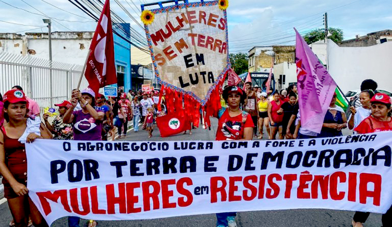 Abrindo o calendário anual de lutas do MST, com a Jornada do 8M, colorida pelos lenços de chita, simbolizando a ousadia, a rebeldia e a combatividade das mulheres Sem Terra; a Jornada representa um enfrentamento coletivo contra os mandos e desmandos do agro-hidro-mínero-negócio, exigindo que esse modelo seja responsabilizado por seus crimes contra a humanidade e contra o meio ambiente.