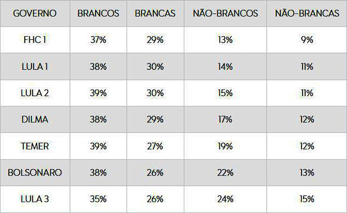 Em 2024, no terceiro governo de Luiz Inácio Lula da Silva (PT), o cenário mudou. Homens negros ou indígenas passaram a ocupar 24% dos cargos, e as mulheres negras ou indígenas, 15%. As mulheres brancas estão em 26% dos cargos de liderança, e os homens brancos seguem ocupando a maior porcentagem, 35%.