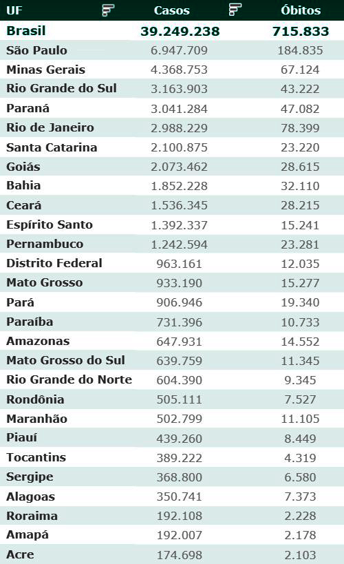 As secretarias estaduais de Saúde contabilizaram, desde o início da pandemia, em todo o país 39.249.238 diagnósticos positivos e 715.833 mortes em decorrência da Covid-19.