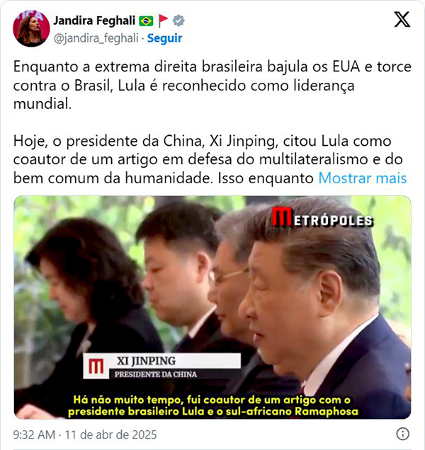 Em meio ao aumento das tensões comerciais entre China e Estados Unidos, o presidente chinês Xi Jinping citou o presidente brasileiro Luiz Inácio Lula da Silva (PT) como referência em defesa do multilateralismo e da cooperação internacional. A menção foi feita nesta sexta-feira (11), durante uma conversa com o primeiro-ministro da Espanha, Pedro Sánchez, em Pequim. As