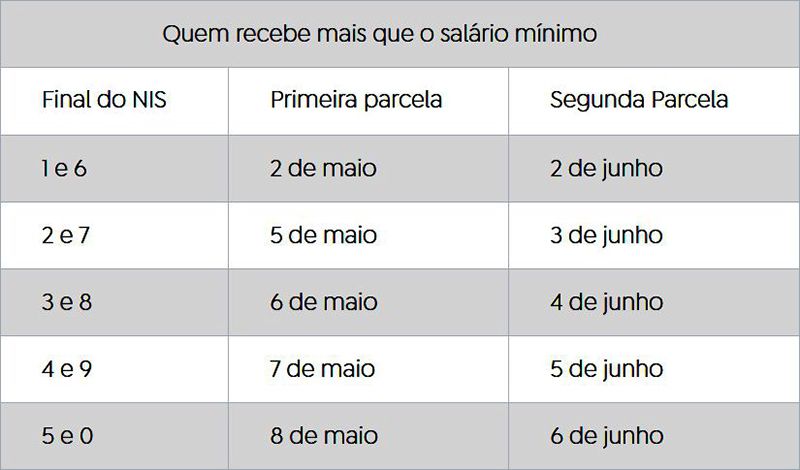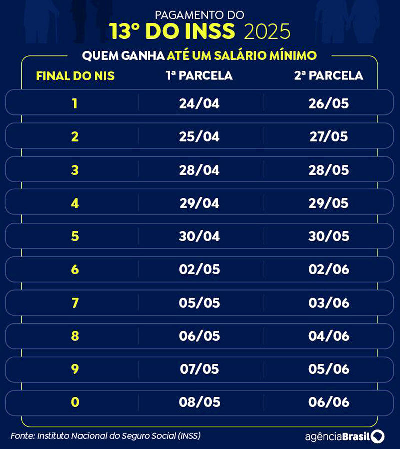 Com a previsão de injetar R$ 73,3 bilhões na economia, a antecipação do décimo terceiro do INSS será paga em duas parcelas: a primeira, de 24 de abril a 8 de maio e a segunda, de 26 de maio a 6 de junho. As datas são definidas com base no dígito final do Número de Inscrição Social (NIS) e com base na renda do beneficiário. Quem ganha apenas o salário mínimo começa a receber antes de quem recebe mais que o mínimo.