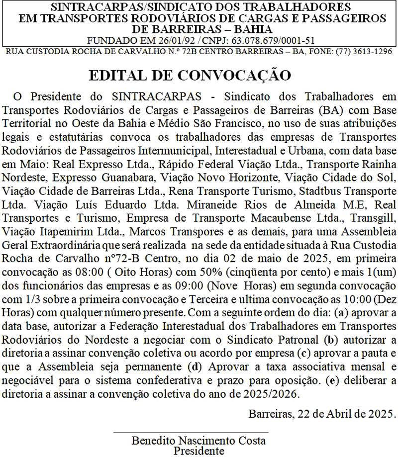 SINTRACARPAS - EDITAL DE CONVOCAÇÃO - ASSEMBLEIA GERAL EXTRAORDINÁRIA