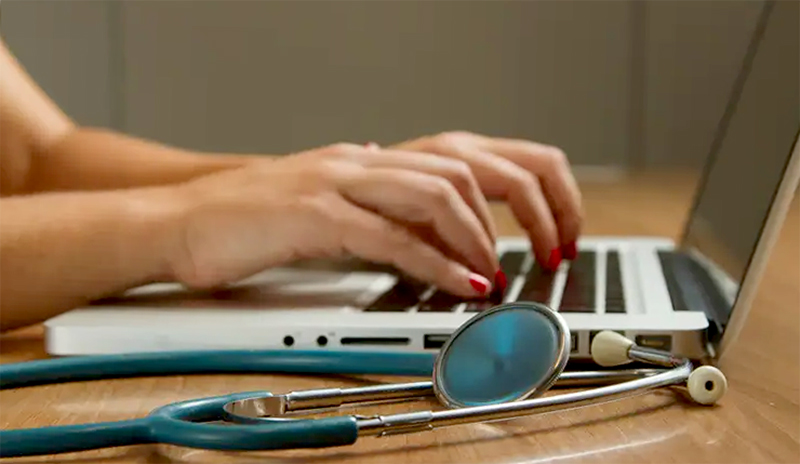 Médica digita no computador, tendo seu estetoscópio ao lado - Foto: National Cancer Institute/Unsplash