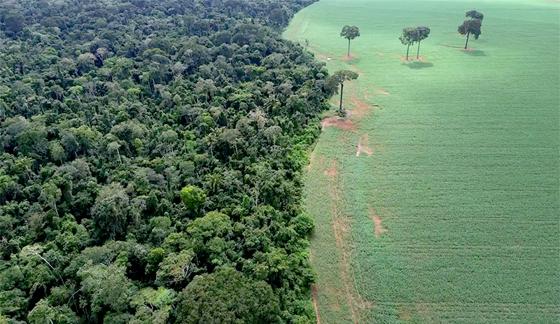 Vista aérea do encontro da Floresta Amazônica com lavouras de milho e soja, na margem da