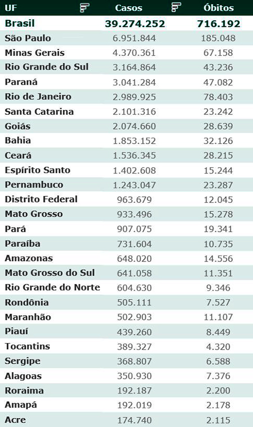 As secretarias estaduais de Saúde contabilizaram, desde o início da pandemia, em todo o país 39.274.252 diagnósticos positivos e 716.192 mortes em decorrência da Covid-19.