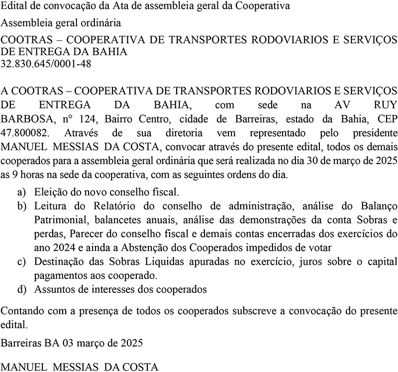 COOTRAS - EDITAL DE CONVOCAÇÃO PARA ASSEMBLEIA GERAL ORDINÁRIA