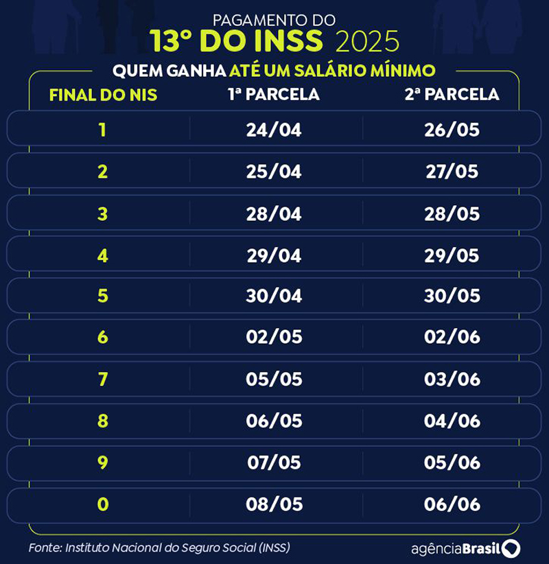 Cerca de 34,2 milhões de aposentados, pensionistas e beneficiários de auxílios do Instituto Nacional do Seguro Social (INSS) começam a receber nesta segunda-feira (26) a segunda parcela do 13º. Feito de forma escalonada, conforme o dígito final do Número de Inscrição Social (NIS), o pagamento vai até 6 de junho.