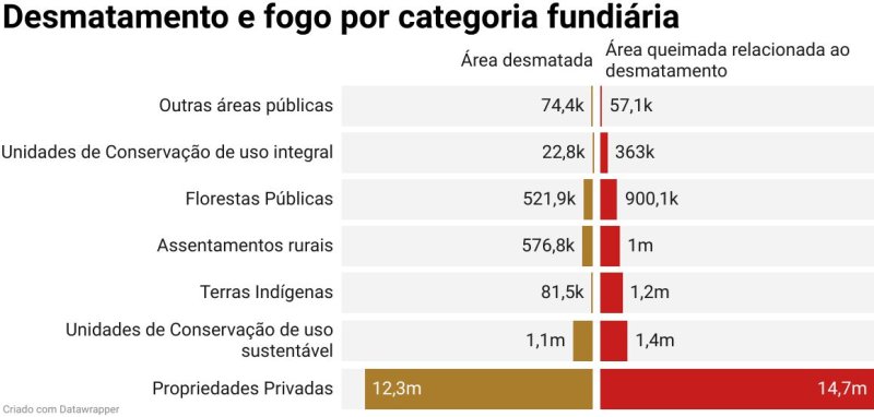 Com 14,7 milhões de hectares de vegetação queimada, as propriedades privadas foram as mais afetadas por incêndios relacionados a desmatamento - 27% de sua vegetação nativa foi consumida por esse tipo de fogo. Em seguida, aparecem as áreas públicas de uso sustentável, com 1,4 milhão de hectares queimados por fogo relacionado ao desmatamento.