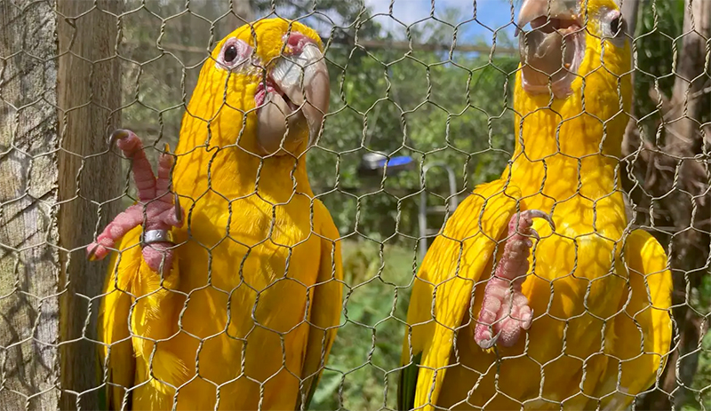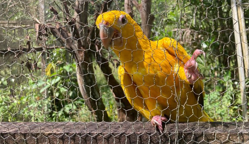 Esses dois indivíduos de ararajuba são vítimas de captura, posse irresponsável e tráfico de animais silvestres, que atingiu cerca de 13 milhões de espécimes de fauna e flora em 162 países, entre os anos de 2015 e 2021, segundo aponta o Relatório Global sobre Crimes contra Espécies Silvestres.