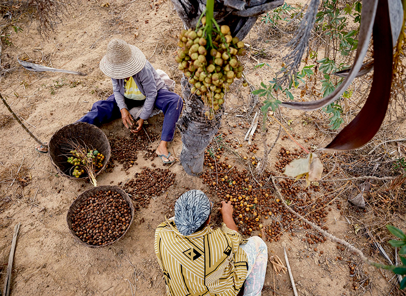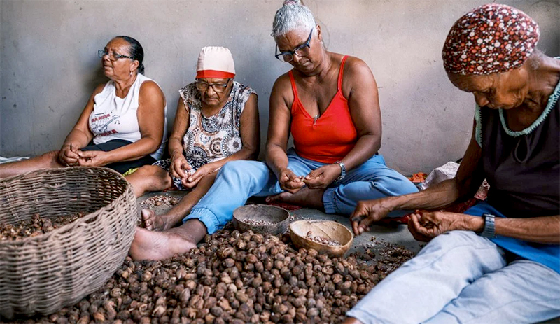 Quebra do licuri é feita manualmente por mulheres cooperadas da comunidade de Alto Capim