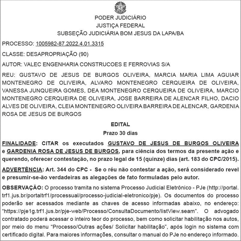 JUSTIÇA FEDERAL - SUBSEÇÃO JUDICIÁRIA DE BOM JESUS DA LAPA (BA) - EDITAL DE DESAPROPRIAÇÃO - GUSTAVO DE JESUS DE BURGOS OLIVEIRA E OUTROS