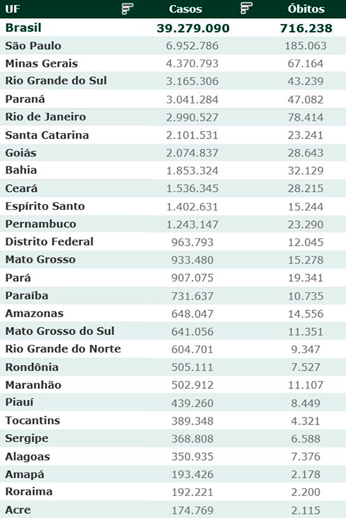 As secretarias estaduais de Saúde contabilizaram, desde o início da pandemia, em todo o país 39.279.090 diagnósticos positivos e 716.238 mortes em decorrência da Covid-19.