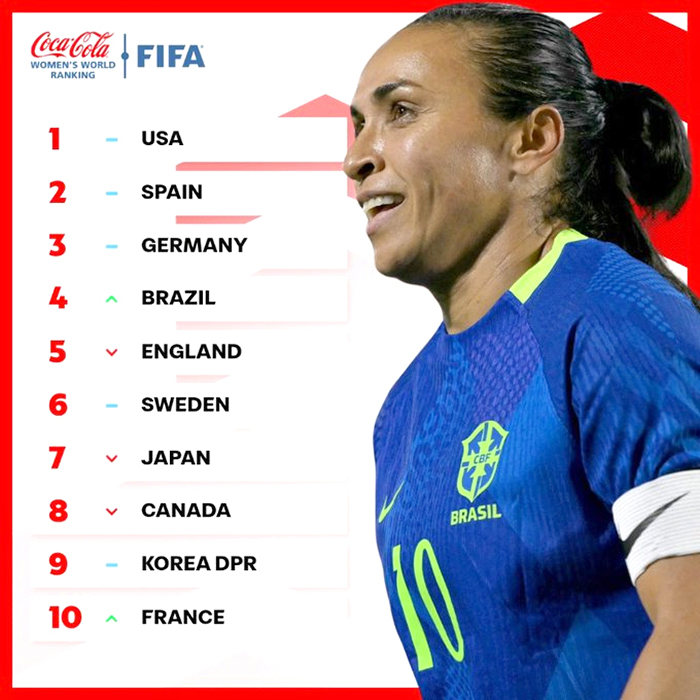 O Brasil conquistou quatro posições no ranking de seleções femininas de futebol, anunciou no dia de ontem, quinta-feira (12) a Federação Internacional de Futebol (Fifa). Desta forma, a equipe canarinho assumiu a quarta colocação da relação, o que não acontecia desde dezembro de 2013.