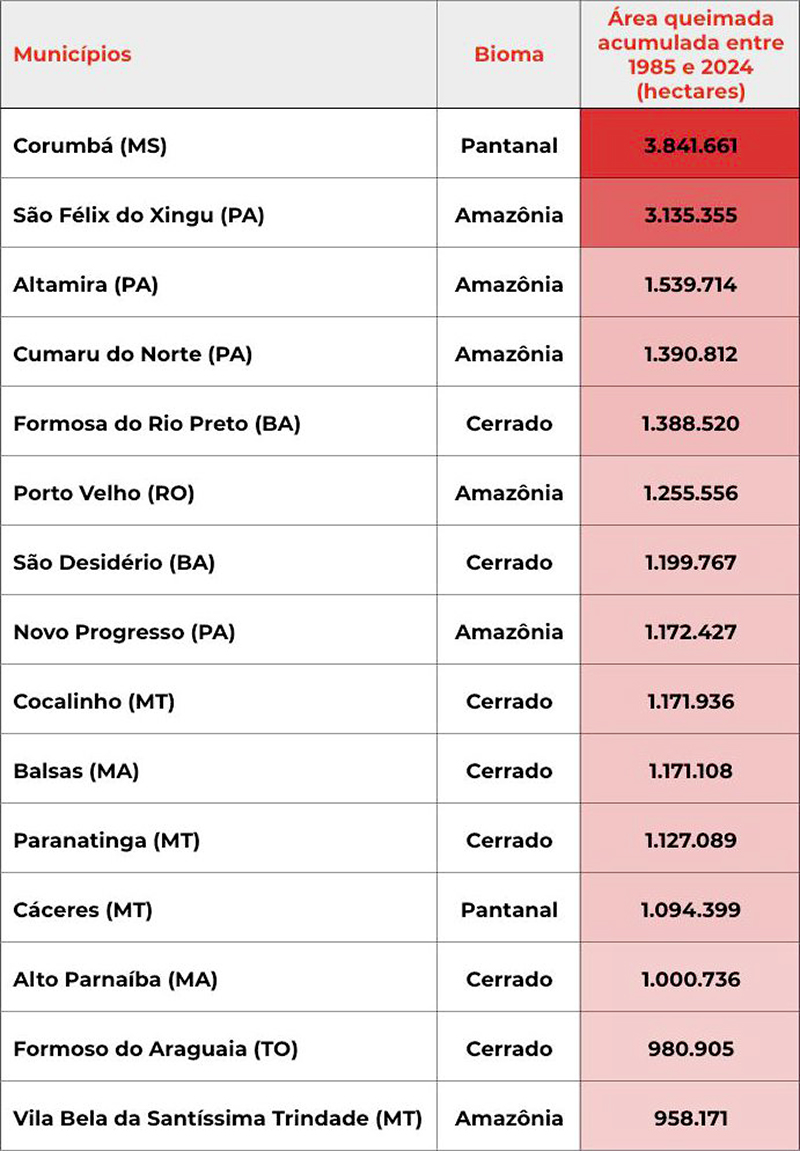 O recorte municipal também mostra cenário parecido de concentração. Apenas 15 municípios, sendo sete localizados no Cerrado, seis na Amazônia e dois no Pantanal, foram responsáveis por 10% de toda a área queimada no Brasil nas últimas quatro décadas. Corumbá (MS) e São Félix do Xingu (PA) lideram a lista, inclusive no ano de 2024, e são os únicos a ultrapassarem a marca de 3 milhões de hectares queimados cada. Juntos, os 15 municípios concentram 22 milhões de hectares atingidos pelo fogo desde 1985.