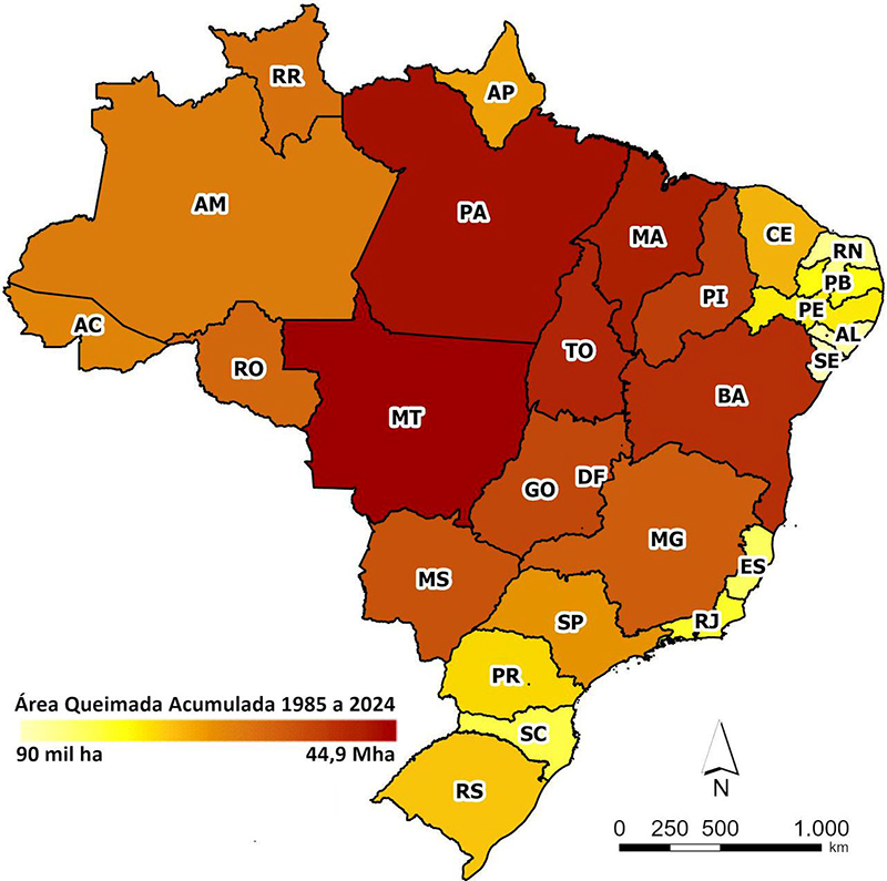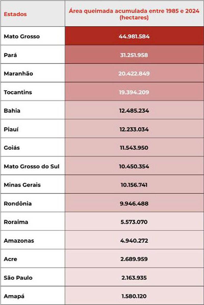Em todo o território brasileiro, o fogo atingiu 206 milhões de hectares ao longo das últimas quatro décadas, o equivalente a 24% do país. Essa área supera o território de países como Irã e Indonésia, e é oito vezes maior que o estado de São Paulo. Somente em 2024, foram queimados 30 milhões de hectares, um salto de 87% em relação a 2023, quando 15,9 milhões de hectares foram atingidos. O total de 2024 ficou 62% acima da média histórica desde 1985.