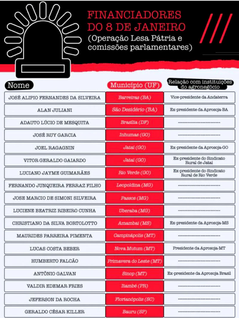 As Origens Agrárias do Terror” — publicado apenas quatro meses após os atos terroristas de 8 de janeiro de 2023. Na época, o levantamento identificou as conexões agrárias de 44 empresários e políticos que atuaram na organização do quebra-quebra na Praça dos Três Poderes, em Brasília, e nos bloqueios a rodovias em cinco estados.