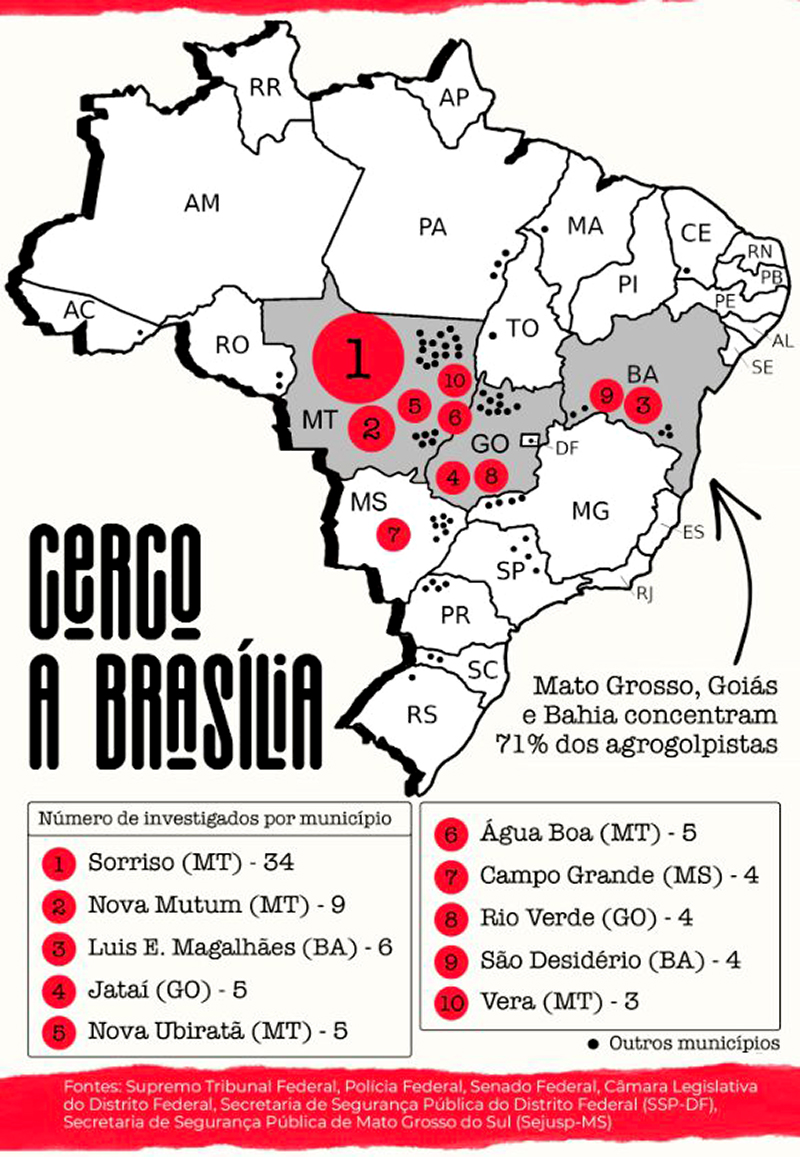 Foi justamente desse eixo de onde saiu a maior parte dos caminhões identificados pela Secretaria de Segurança Pública do Distrito Federal (SSP-DF) entre os veículos estacionados em frente ao Quartel General (QG) do Exército em Brasília: 56 dos 234 caminhões enviados ao acampamento golpista tinham origem em Sorriso (MT), o maior polo produtor de soja do mundo.