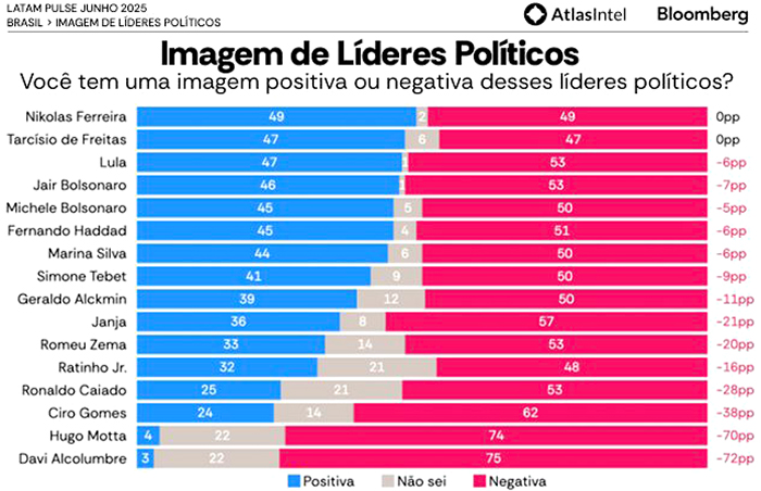 A diferença entre imagem positiva e negativa é abissal, contrastando com a percepção de outras figuras políticas de peso. A pesquisa incluiu nomes como o presidente Luiz Inácio Lula da Silva (PT), que mantém um equilíbrio relativo (47% de imagem positiva e 53% de negativa, com saldo de -6 p.p.).