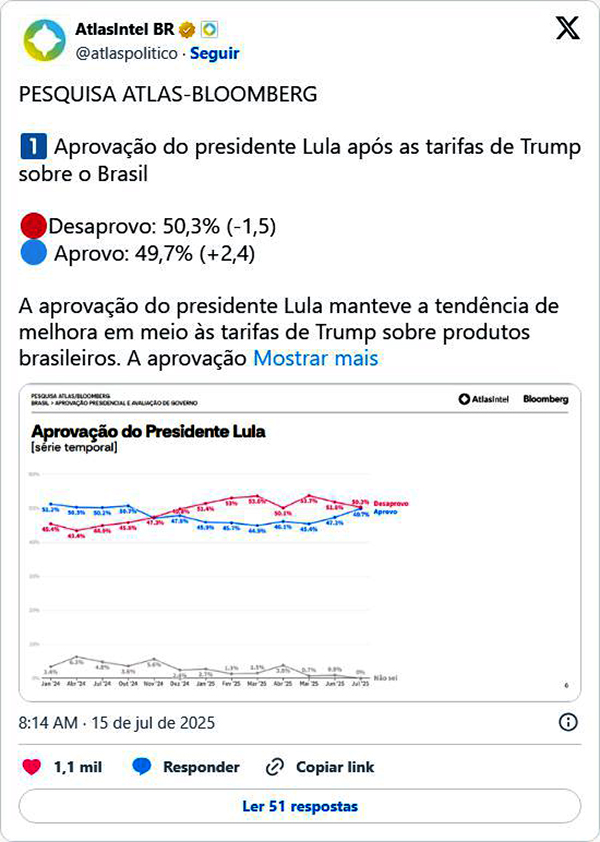 A aprovação do presidente Luiz Inácio Lula da Silva voltou a crescer e alcançou 49,7%, segundo nova pesquisa Atlas-Bloomberg divulgada nesta terça-feira (15). A desaprovação caiu para 50,3%, o que representa um empate técnico entre os dois índices e indica a continuidade da tendência de recuperação da imagem presidencial iniciada nos últimos meses. A sondagem mostra o maior nível de aprovação desde outubro de 2024, antes do período de queda.