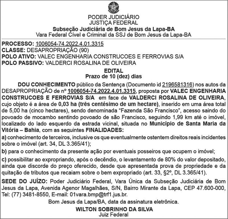 JUSTIÇA FEDERAL - SUBSEÇÃO JUDICIÁRIA DE BOM JESUS DA LAPA (BA) - EDITAL DE DESAPROPRIAÇÃO - VALDERCI ROSALINA DE OLIVEIRA - ÁREA RURAL DA FAZENDA SÃO FRANCISCO NO MUNICÍPIO DE SANTA MARIA DA VITÓRIA - BAHIA