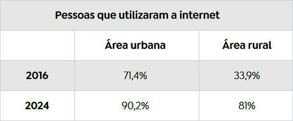 O estudo do IBGE revela desigualdades regionais relacionadas ao acesso à internet. Enquanto na área urbana, 94,7% dos lares têm internet, na zona rural o índice é de 84,8%.