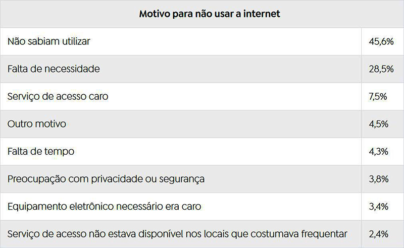 O instituto buscou saber os motivos que deixaram 20,5 milhões sem acessar a internet. Não saber mexer e falta de necessidade são as duas razões mais apontadas.