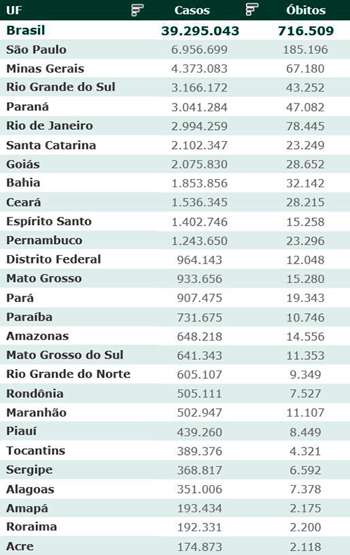 As secretarias estaduais de Saúde contabilizaram, desde o início da pandemia, em todo o país 39.295.043 diagnósticos positivos e 716.509 mortes em decorrência da Covid-19.