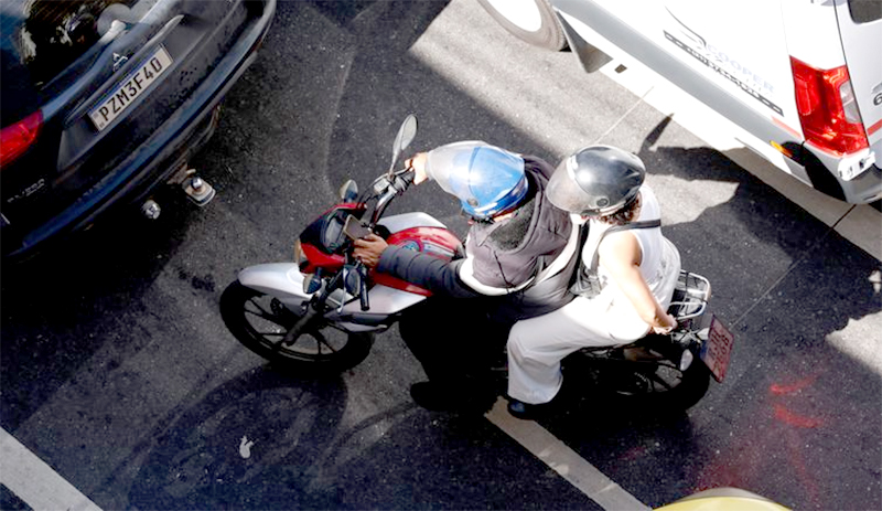 “Idealmente, os dois, condutor e passageiro da moto, deveriam estar com roupas adequadas: botas, calças de couro, jaqueta de couro e capacete. Na prática, a gente não vê isso nos condutores e muito menos no passageiro, que, muitas vezes, está de sandália, roupa curta e com o celular na mão em vez de estar segurando no piloto.”