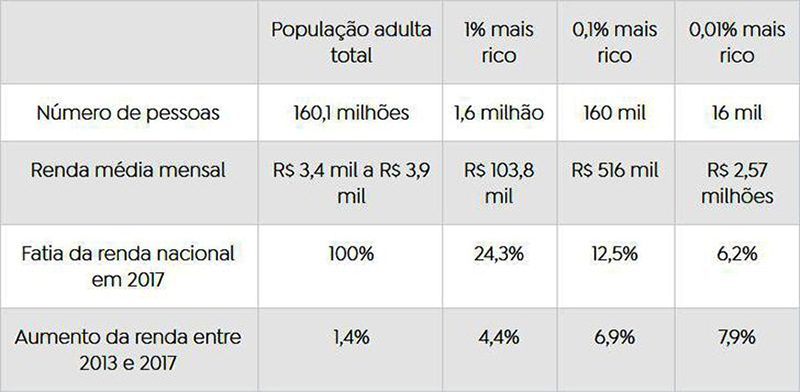 Para efeito de constatação, em relação ao 0,01% mais rico, o estudo indica que o rendimento médio é superior a R$ 2,5 milhões, enquanto a Pnad estima pouco mais de R$ 200 mil, citam os pesquisadores.
